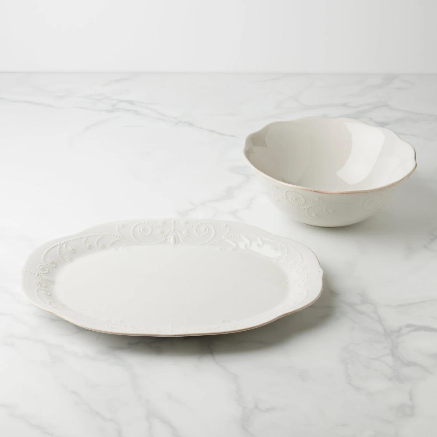 Ready, set, serve! Our beloved French Perle pattern features raised beads and carved textures. Crafted to meet all your serving needs. Includes a serving platter and a serving bowl.
